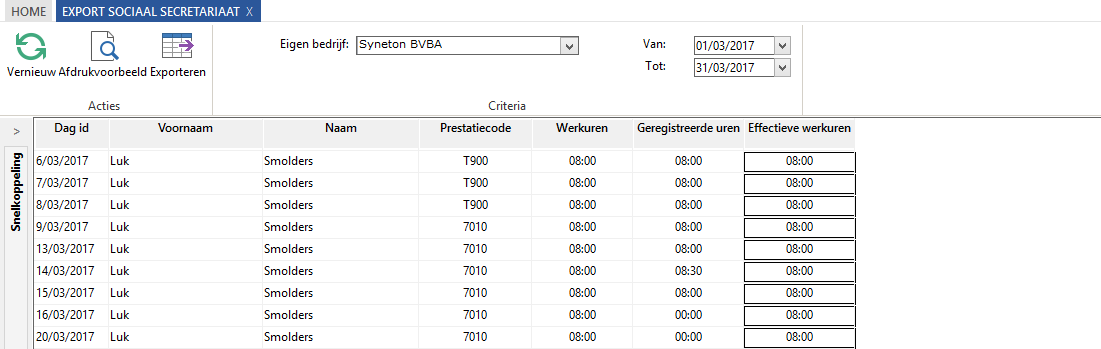 Hier krijg je dan een overzicht van alle gewerkte uren/verlof. Je kan hier nog gaan wijzigen. Bovenaan kan je een periode gaan instellen. Als je op de ribbonknop “exporteren” klikt worden de gegevens geëxporteerd naar een file. Deze file zal kan u gaan inlezen in het portaal van SD Worx.