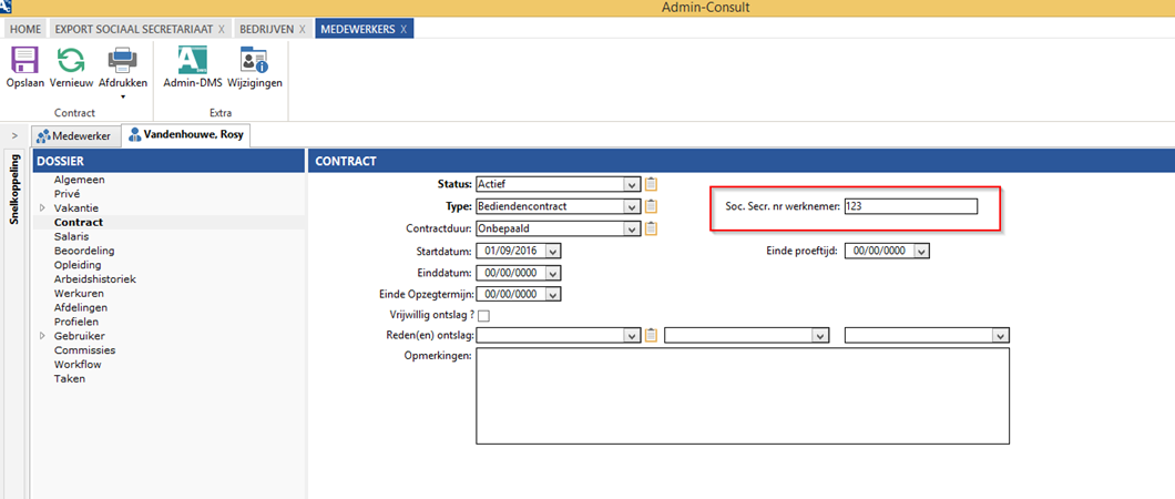 Op medewerker niveau dien je het nummer van de werknemer te gaan toevoegen. Dit bepaalt of een medewerker wordt opgenomen in het rapport "export sociaal secretariaat".