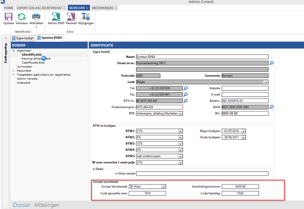 Bij eigen bedrijf dien je te configureren naar welk sociaal secretariaat je wenst te synchroniseren. Aansluitingsnummer, code gewerkte uren en code van een feestdag dienen eveneens te worden ingevuld.