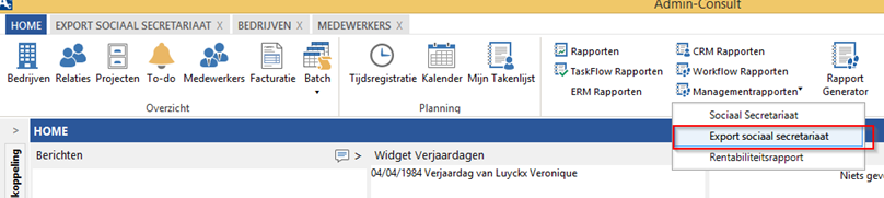 Na alle parameters ingevuld te hebben kunnen we gaan synchroniseren. De functie vinden we onder managementrapporten -> Export sociaal secretariaat.