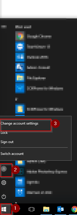 - Klik op het Windows icoon links onderaan uw PC (punt 1 op onderstaande printscreen)