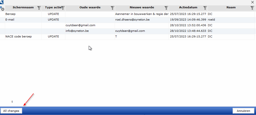 Indien u oudere gegevens wenst kan dat via de knop 'Alle wijzigingen' , let op dit gaat gevoelig trager verlopen gezien dit uit een backup moet opgehaald worden.